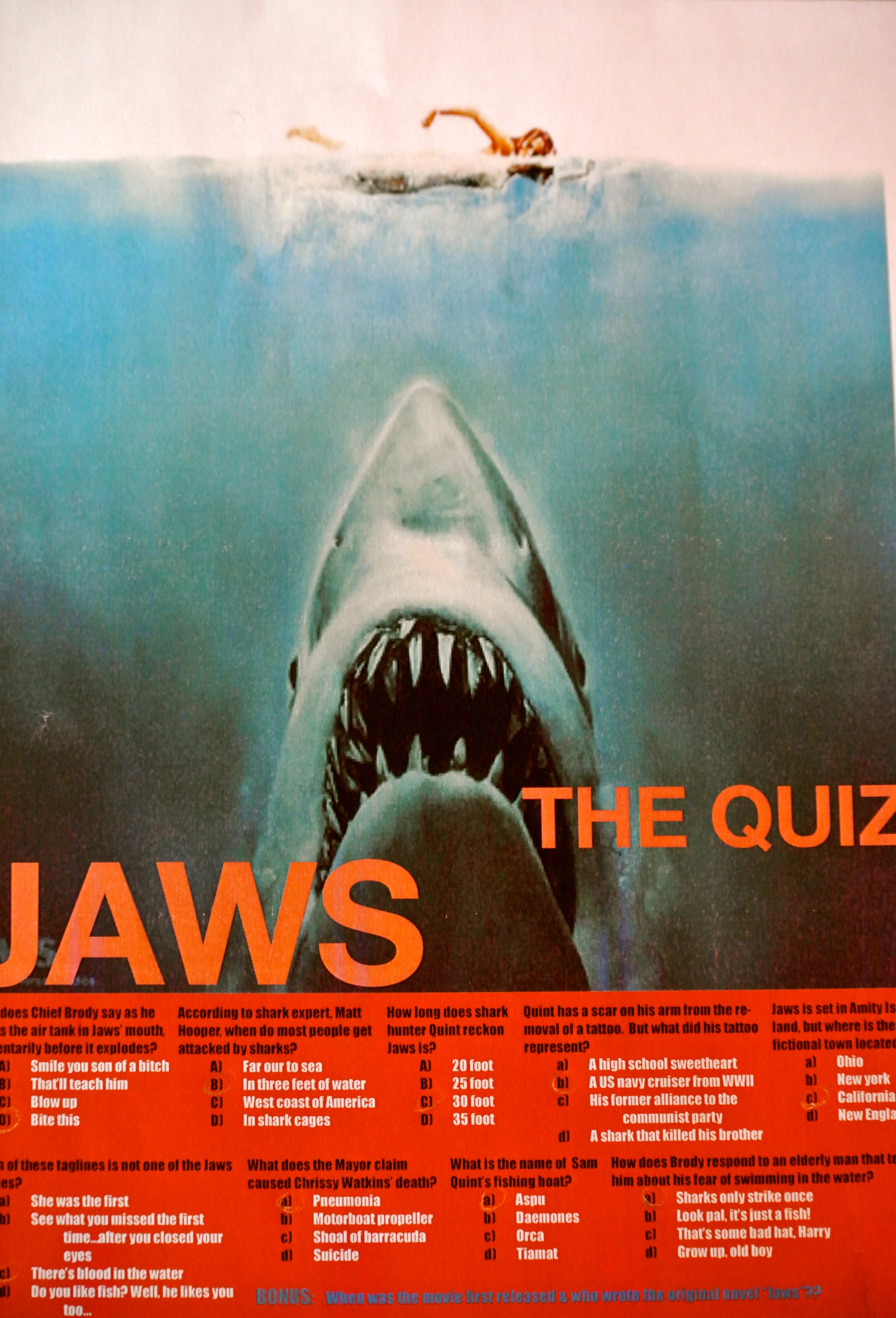 Realising early on that some of the party had not, in fact, EVER seen Jaws (Yes, you did read that correctly!!), I quickly procured our copy to educate these deprived individuals. This was necessitated partly by the fact that I had prepared a Jaws Quiz especially for the occasion…