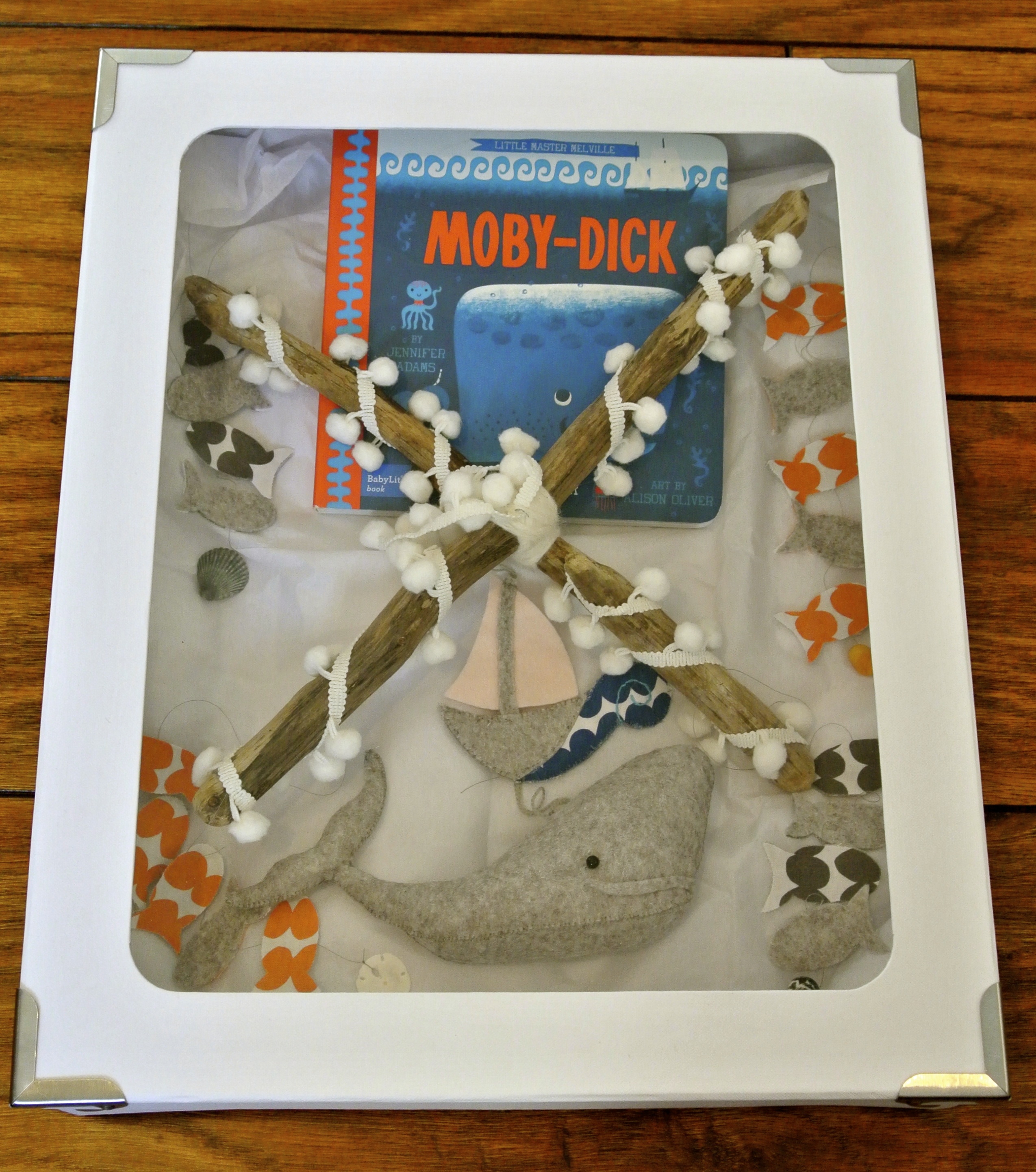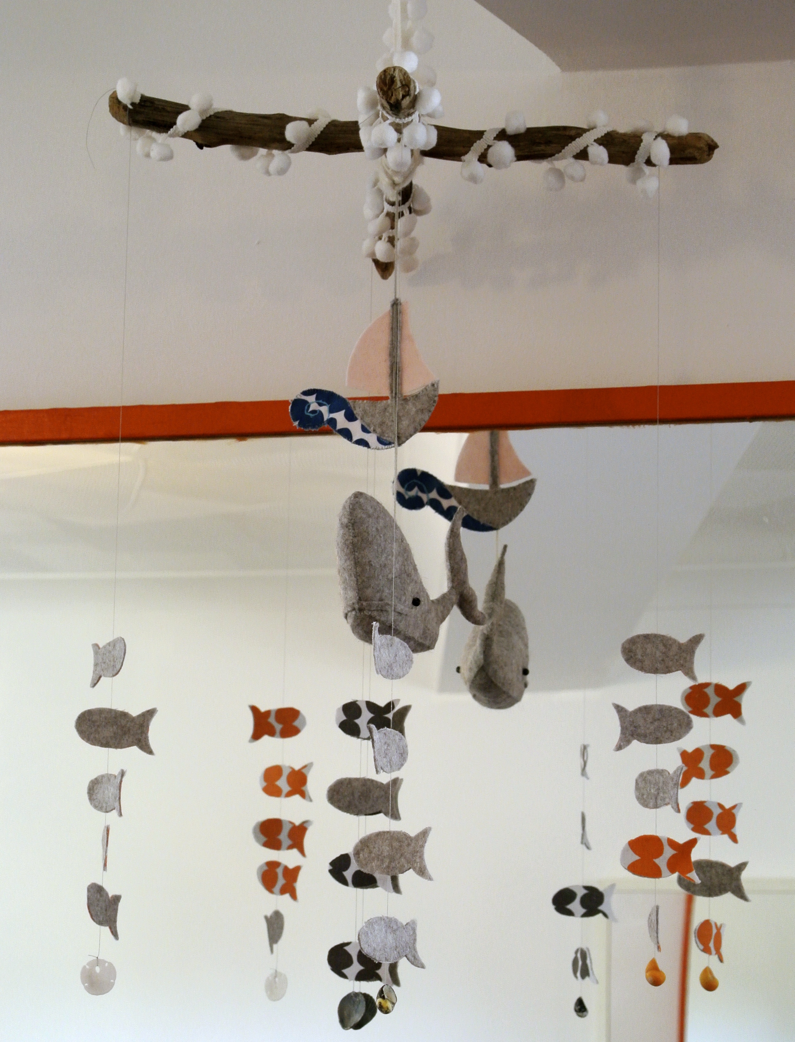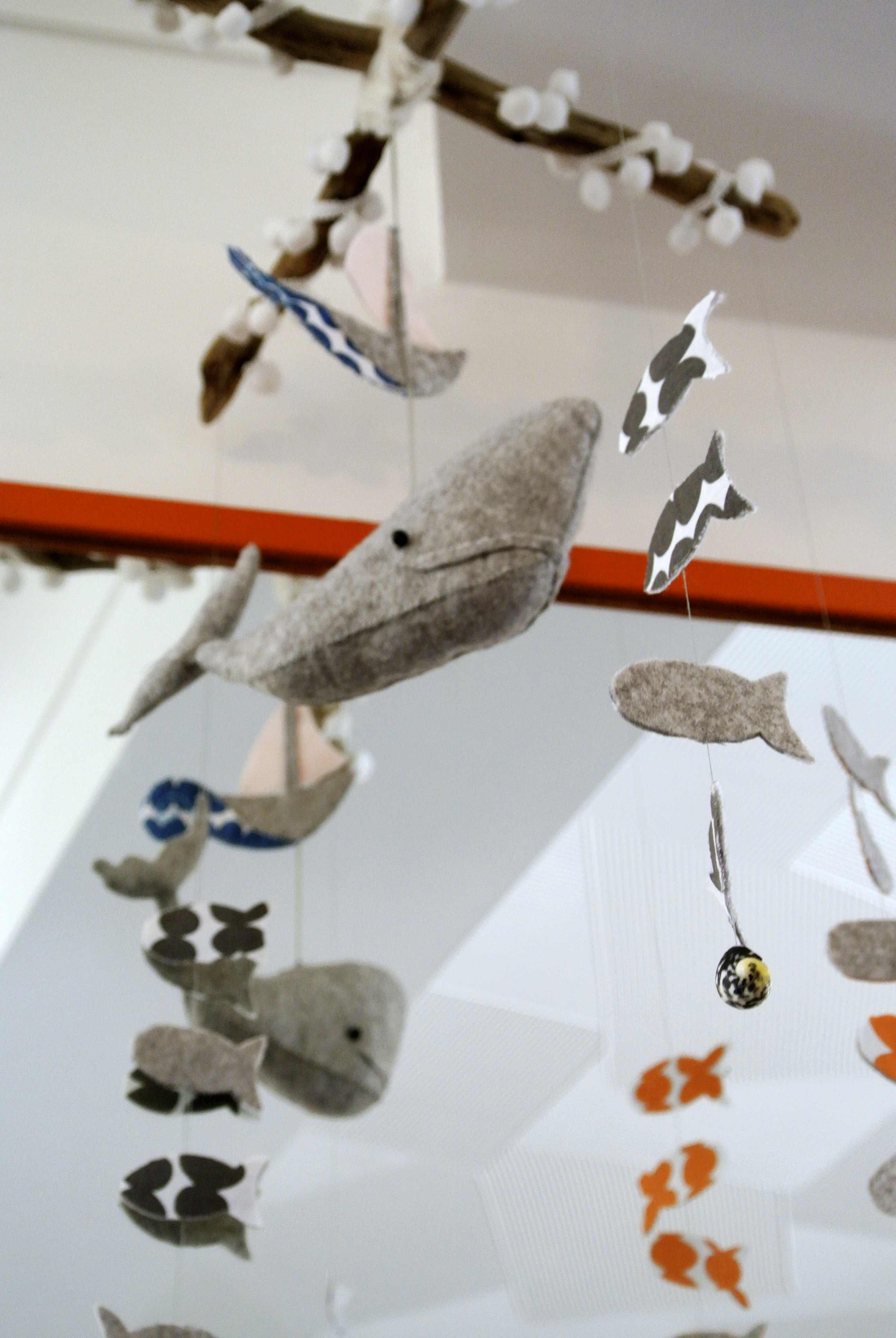 The mobile was made using grey marl felt for Moby; spotty grey and orange fabric for the shoal, and DRIFTWOOD collected from LAVERNOCK beach just outside Penarth, which just also happens to be a geologist’s delight, if you’re interested…