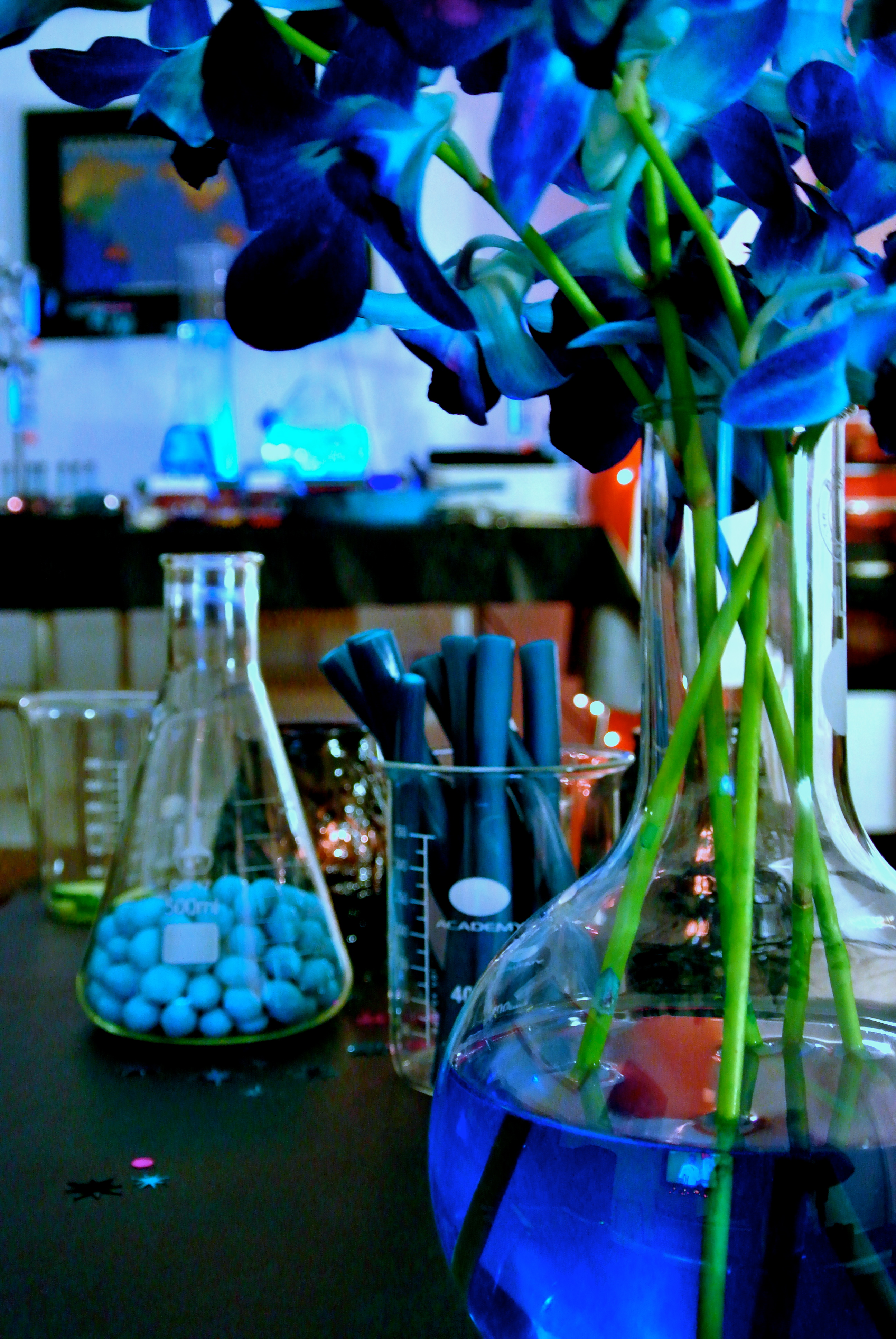 Beakers, conical flasks, volumetric flasks, test tubes and clamps set the scene, and a black light along with a special delivery of DRY ICE from Chillisticks added the finishing touches to the display.