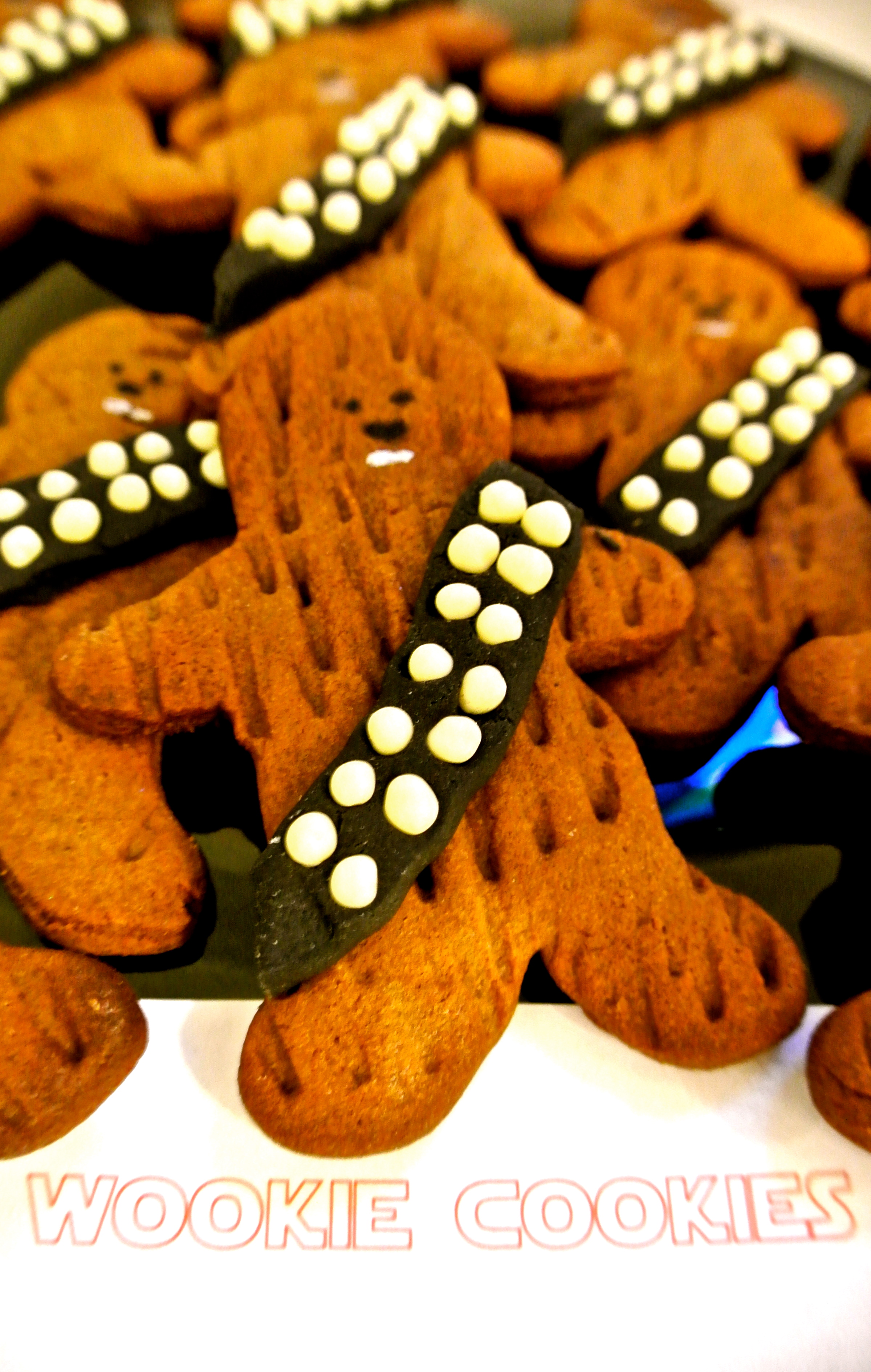I used black coloured fondant icing as it was easy to cut and apply. The white bits are rice chocolate bits from the baking isle. For the wookie shaped head I just flattened the gingerbread man’s head a little. So much fun to make!