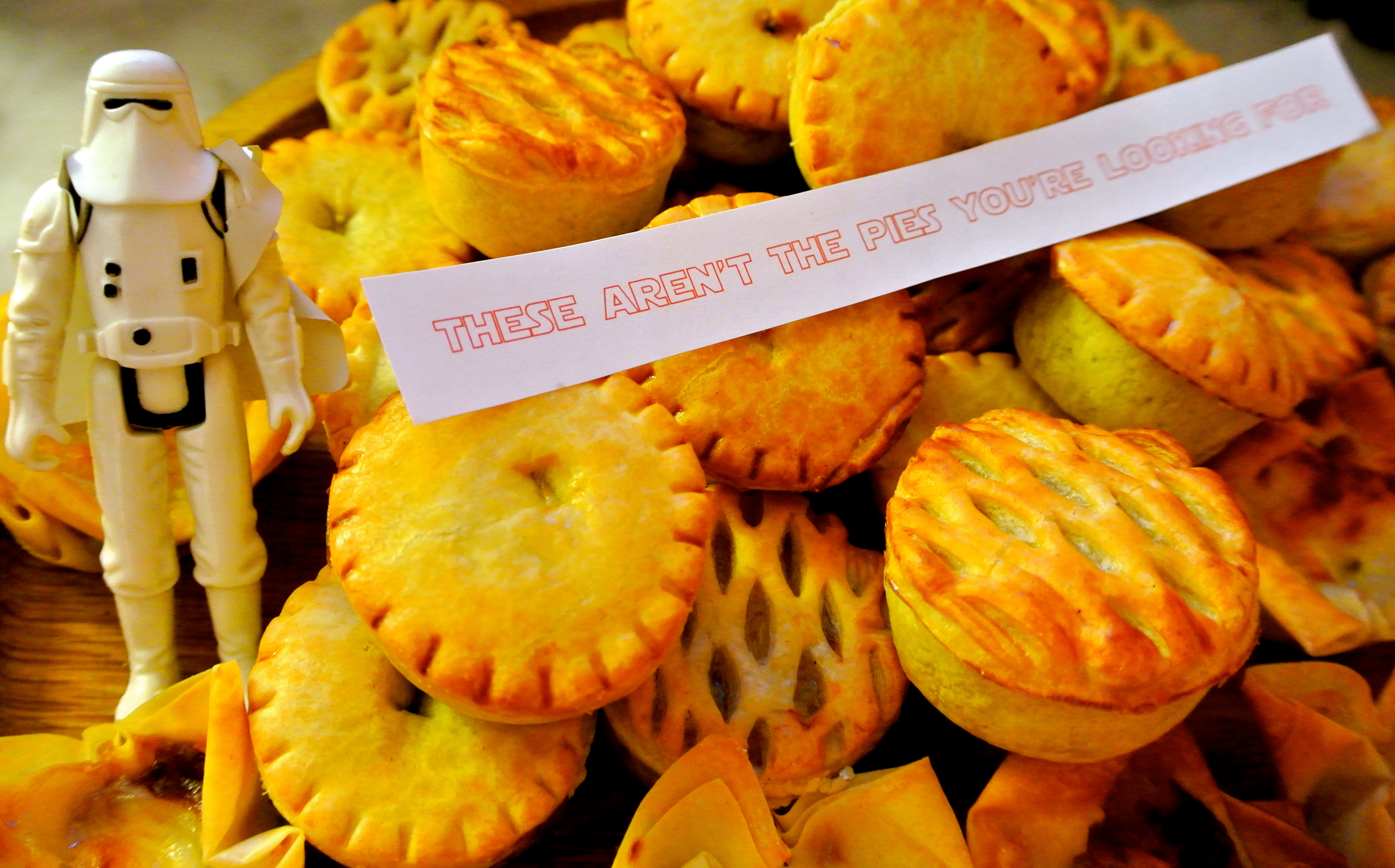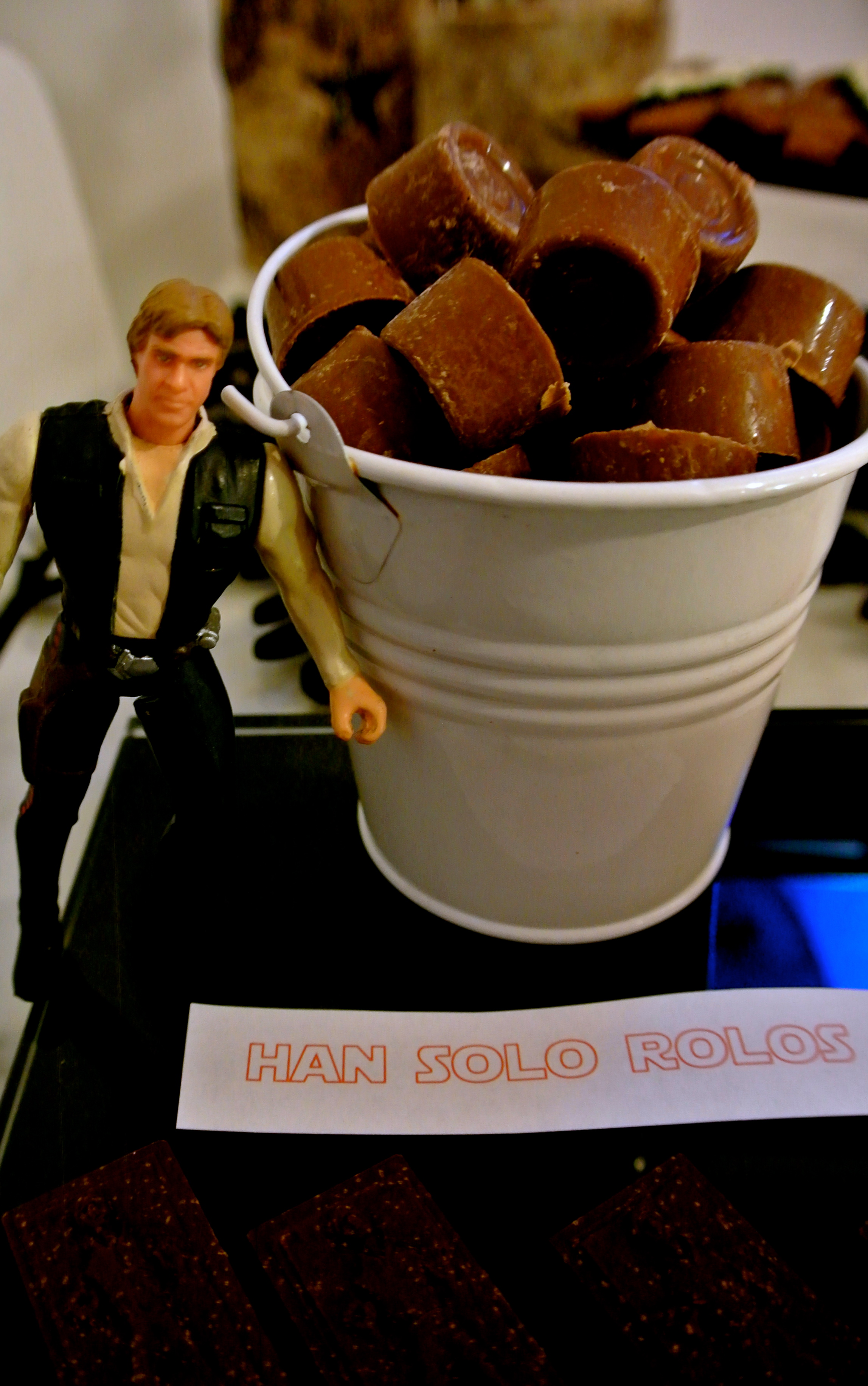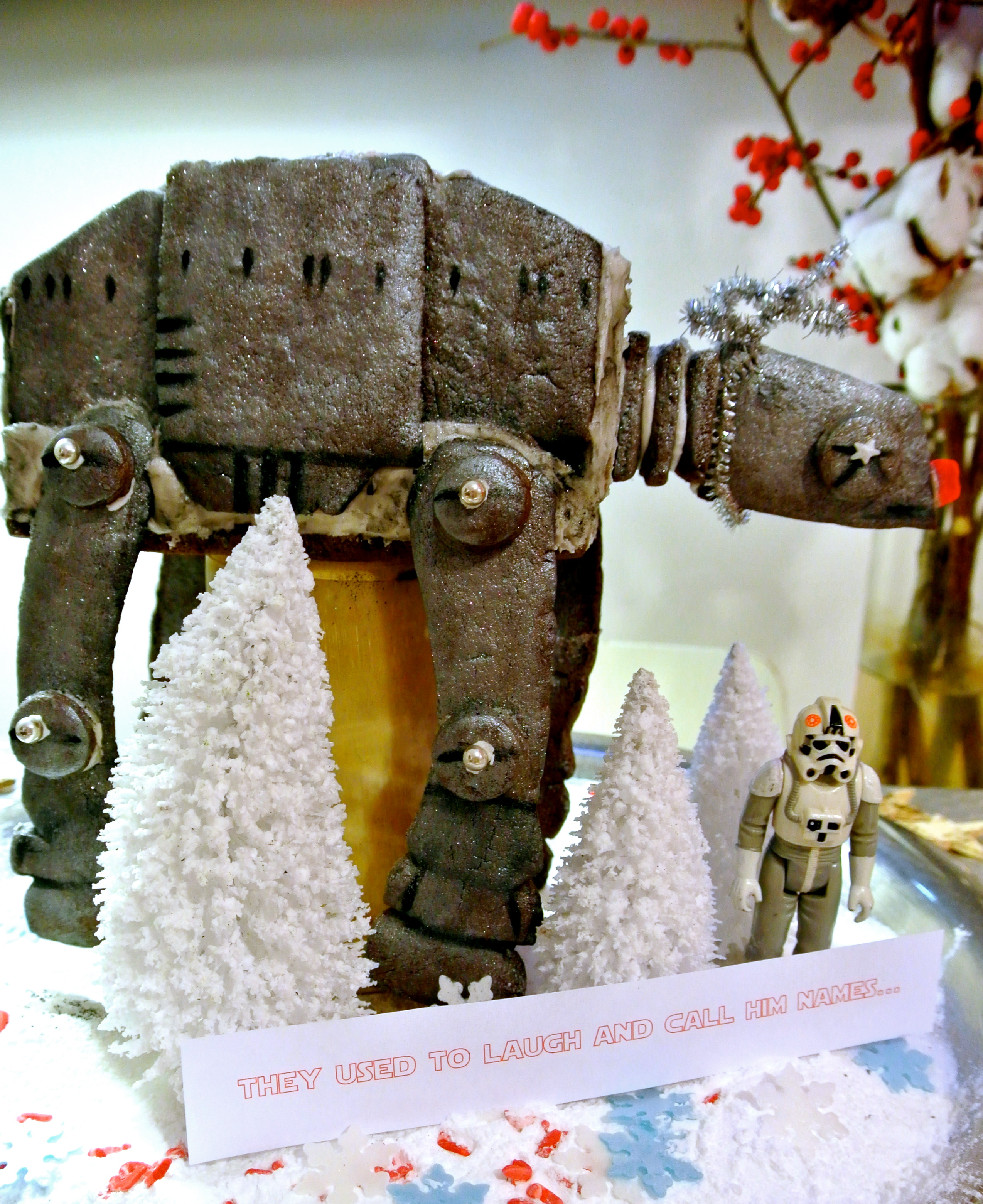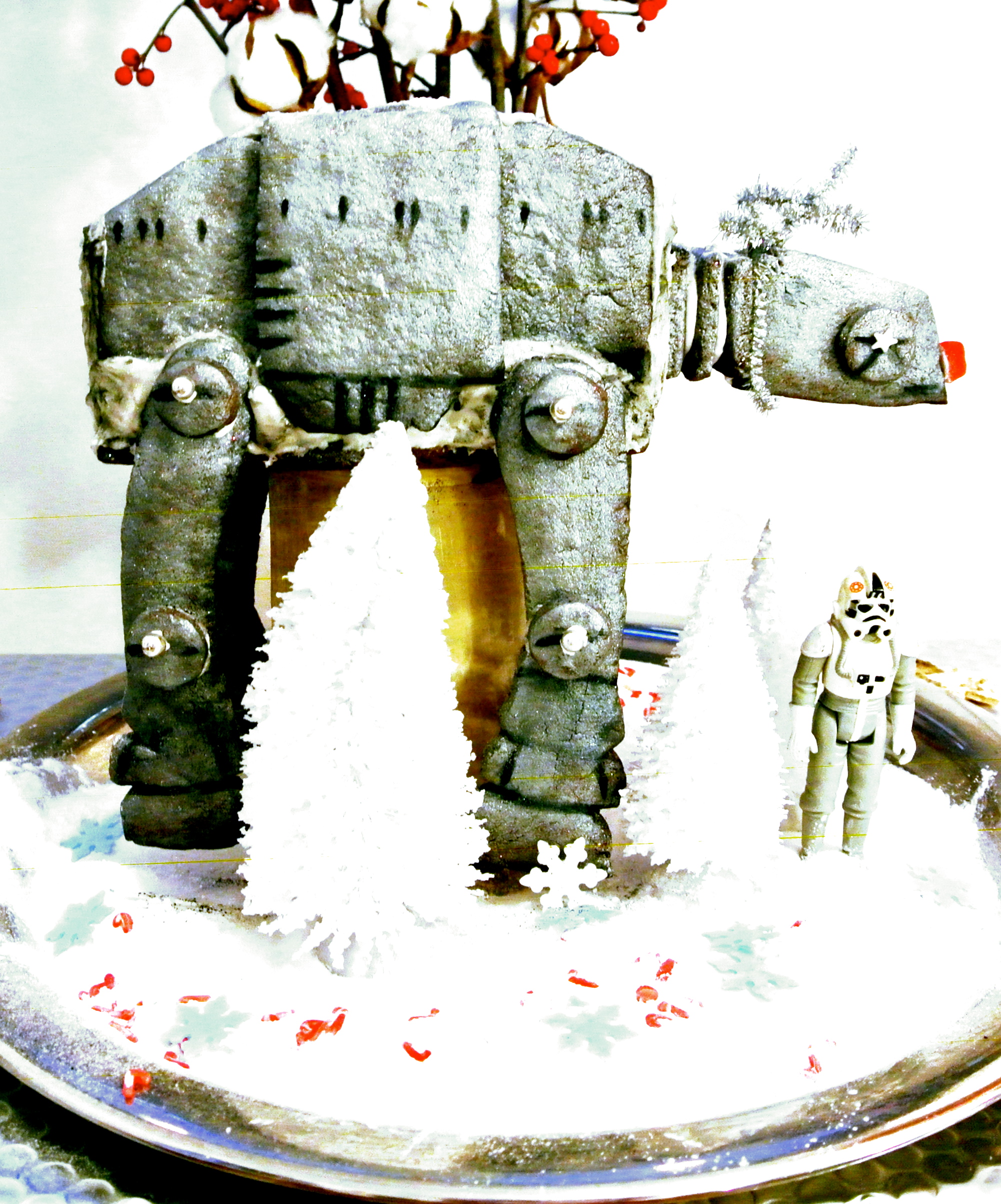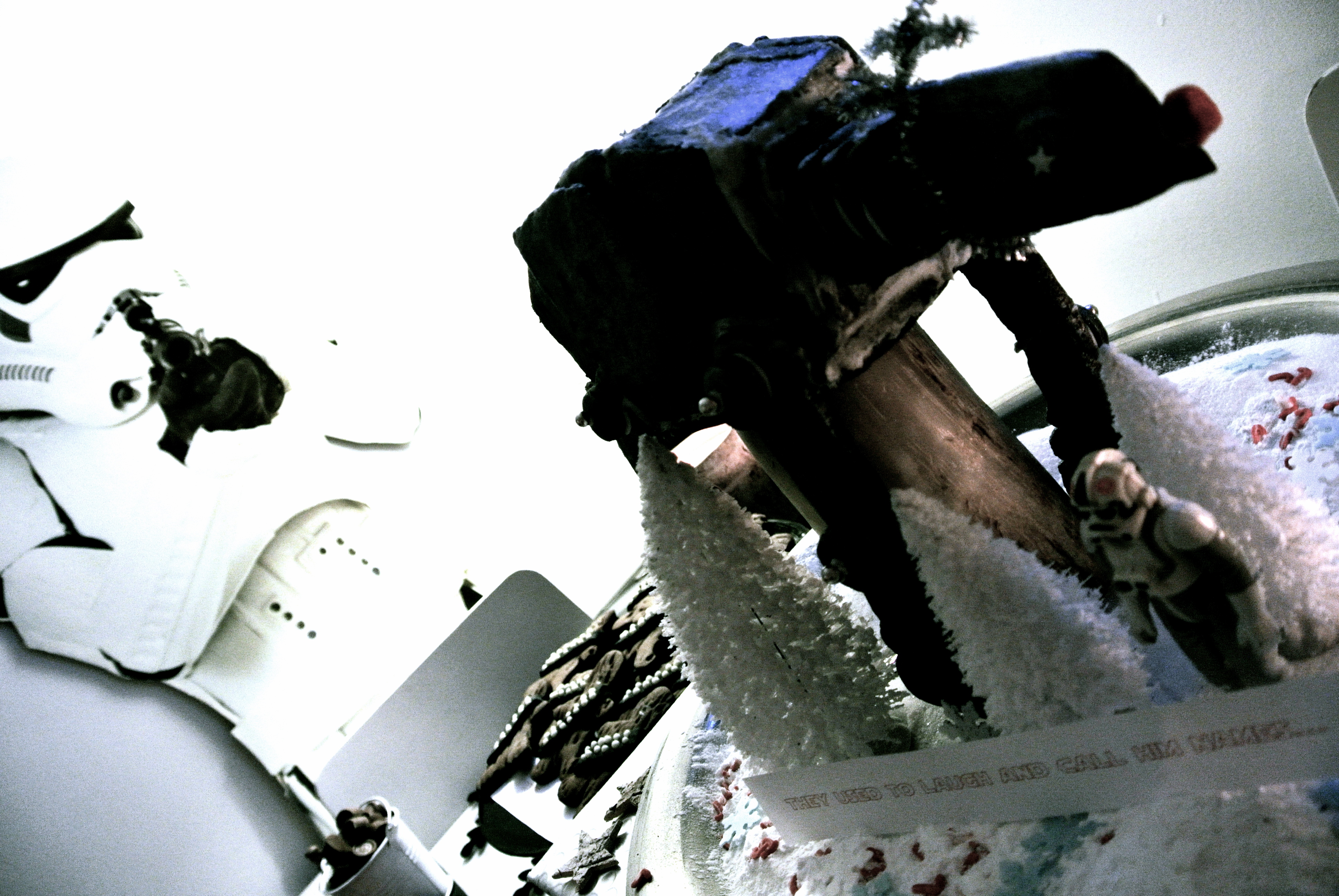 The snowy scene at the Battle of Hoth seemed like it was made with a gingerbread future in mind, and having printed off some blueprints online, I set out to create one of the most challenging culinary treats I have thus far attempted. It really was like creating, and then assembling, an Ikea flat-packed product: the individual gingerbread pieces having to be cut, baked, and then “glued” together with sticky royal icing. The poor brittle legs did not, unfortunately, support the weight of the main body casing, but a well placed cup did the trick to hold this marvel in place. Hoth was easily recreated using icing sugar, bristle snow trees and a vintage 1980 AT-AT driver figure (not to scale, of course!).Decor