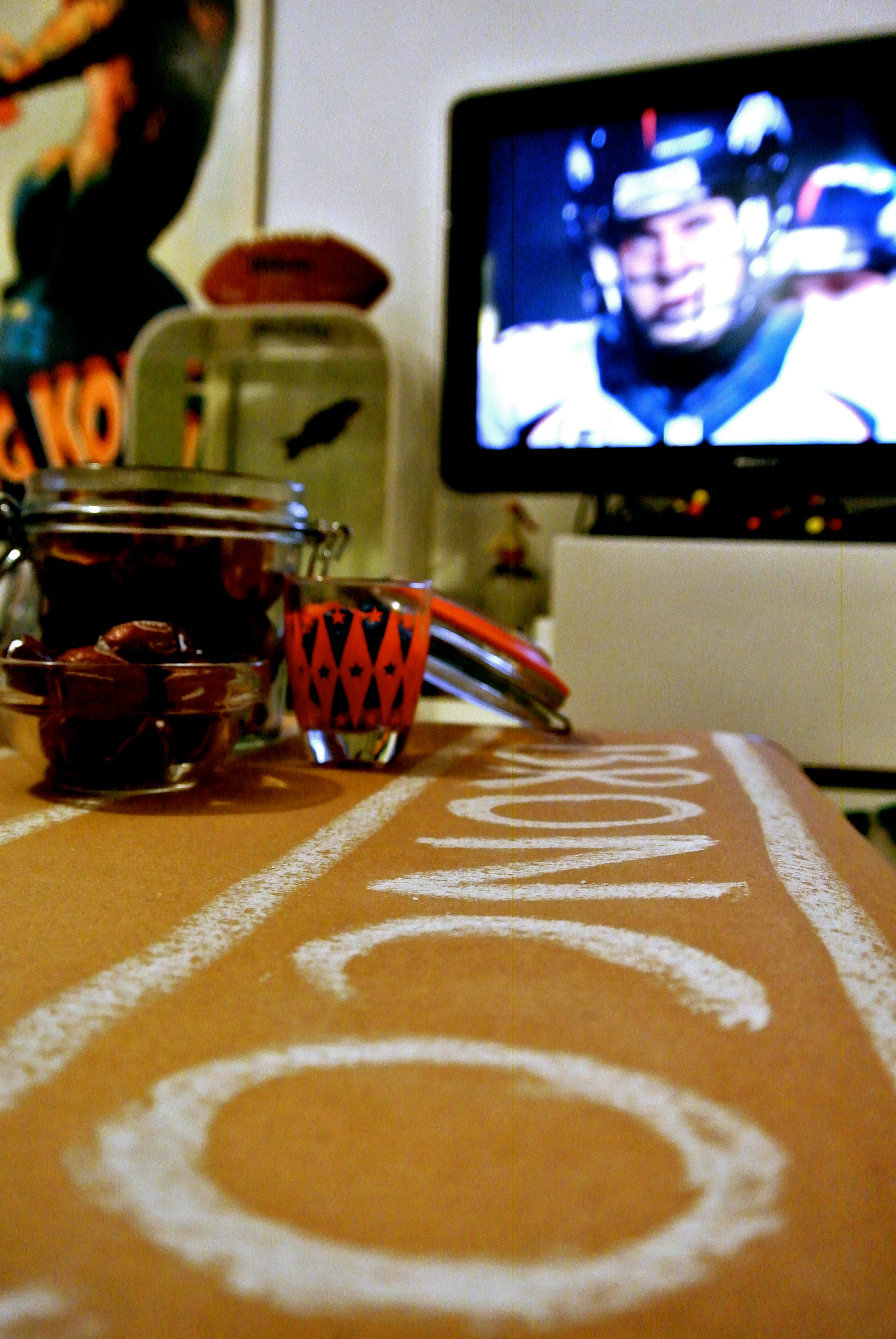 After the hugely ambitious Snackadium challenge I put myself up to last year, for Super Bowl XLVIII, we decided to have a far more low-key event. Once again, simple brown packaging paper was used as covering for our coffee table, and we drew on chalk yard-lines onto the paper to have our own mini football field as the centre-point. We also resurrected last year’s felt bunting for hassle free decorations.