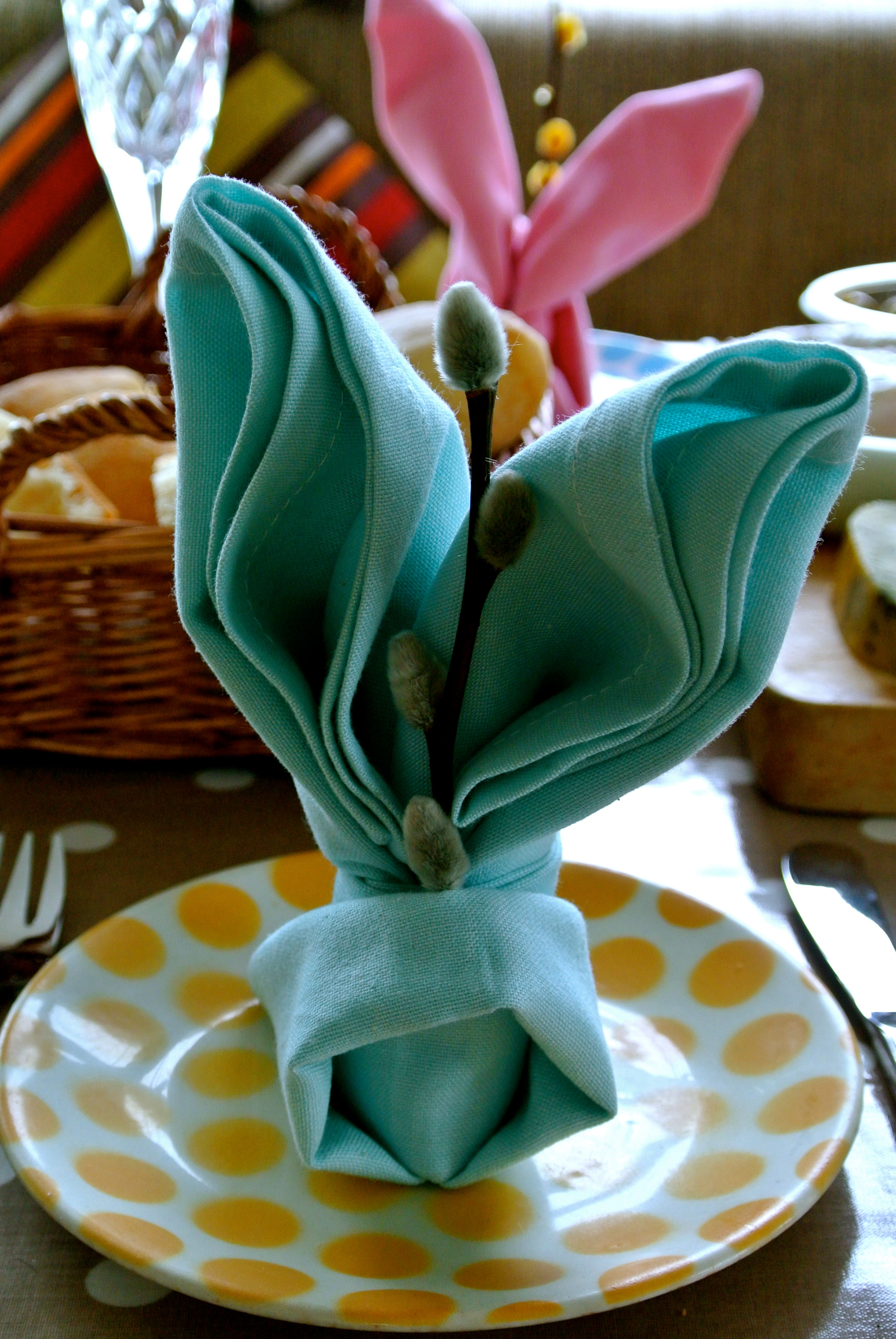 Our pastel napkins were transformed into bunnies, also adorned with a sprig of catkins, to represent the bob tail of the bunny rabbit.