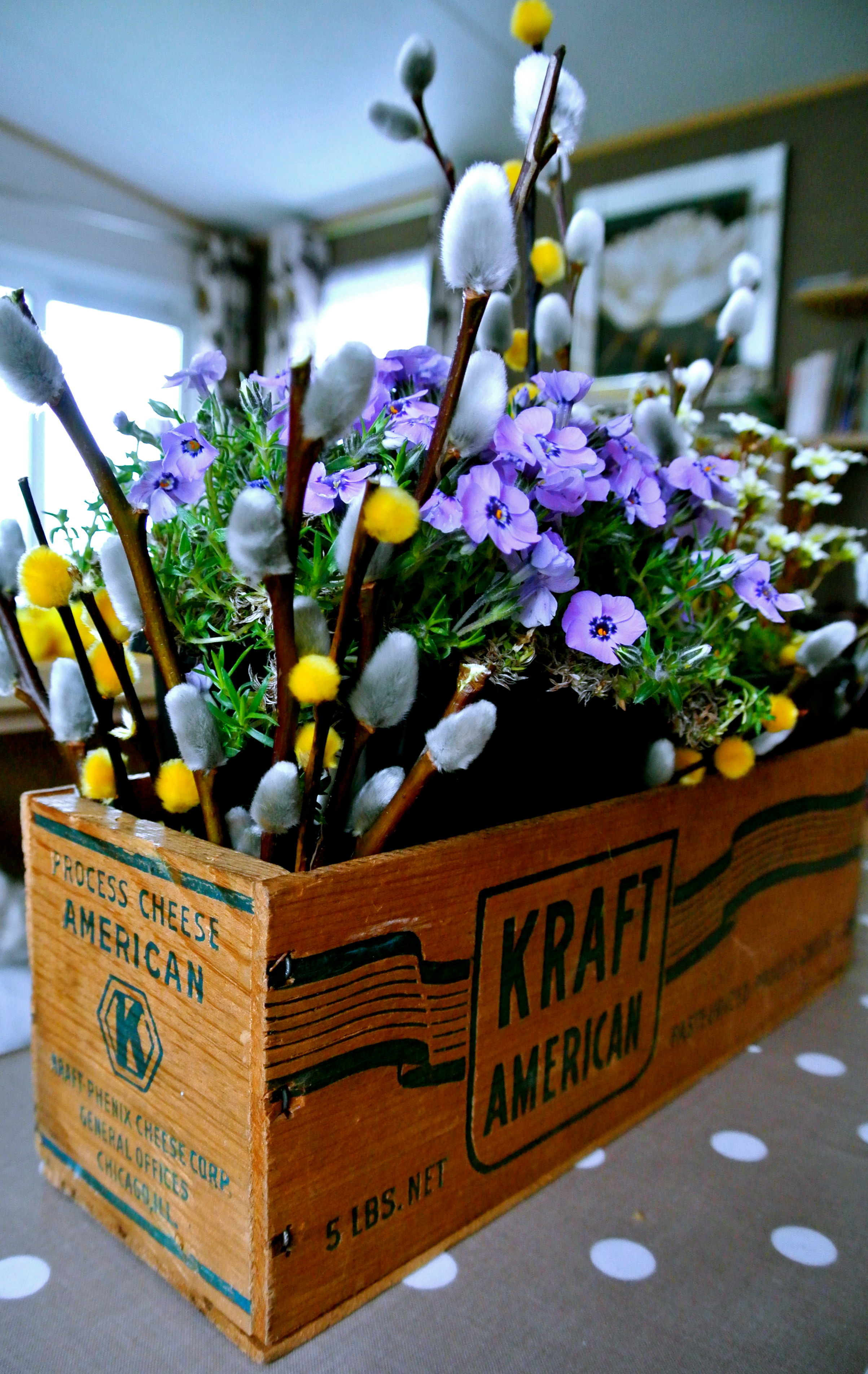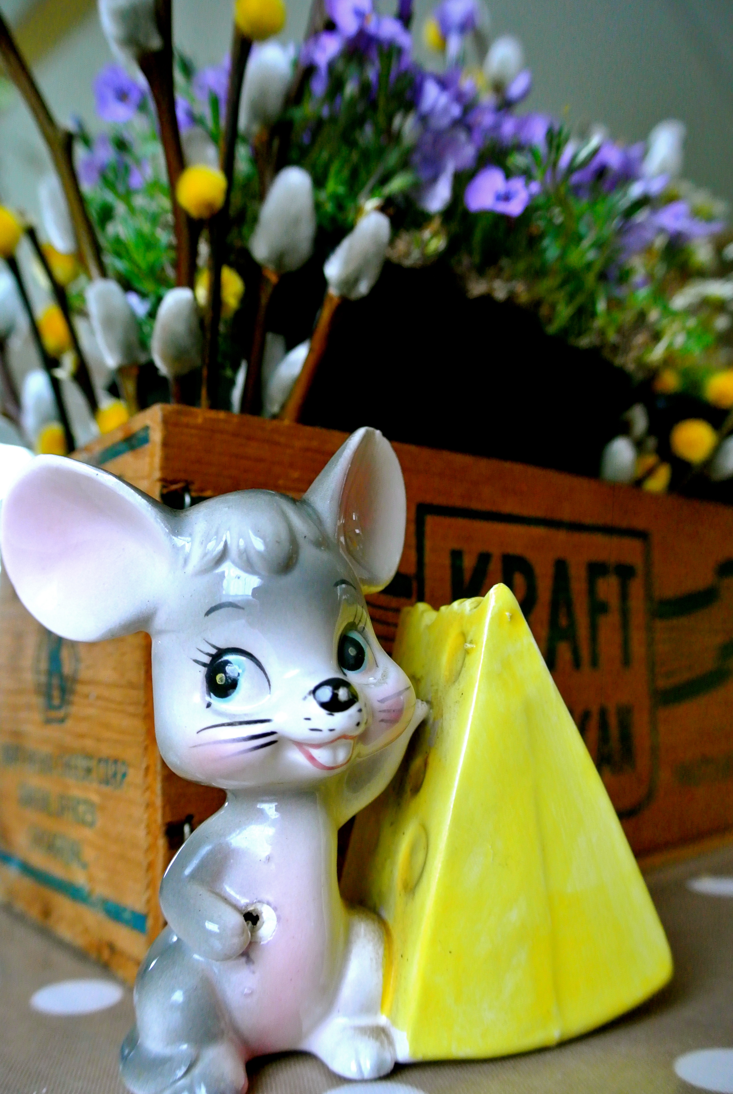 Our Easter supper this year was a simple cheese board and other snacks, framed with a lovely vintage Kraft American process cheese crate (purchased from an Etsy store) and retro cheese “pixies”.