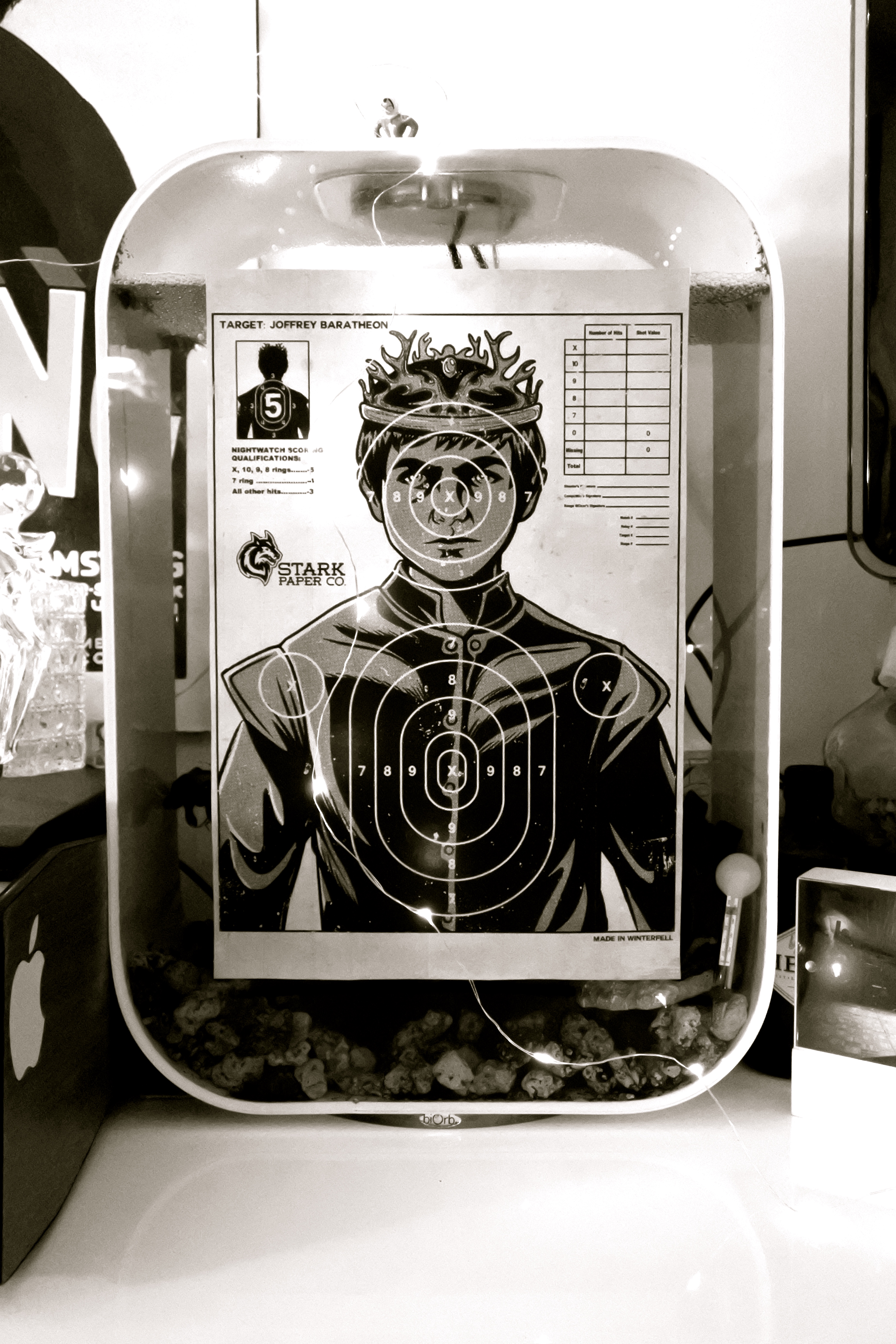 Joffrey, officially one of the Baratheon’s, but in truth a pure bred Lannister, is silhouetted here poised and ready for a spot of target practice, a nod to the sadistic nature of the young king. Lannister gold coins also adorned.