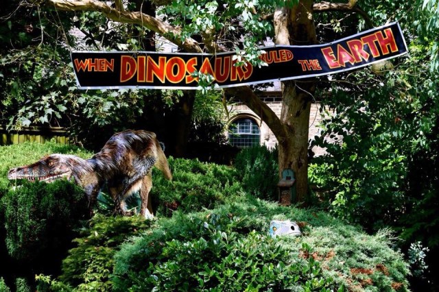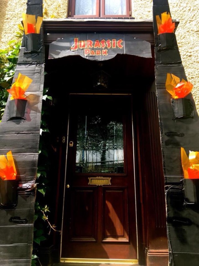 It was quite easy to find plenty of Dino-themed decorative pieces online, helped no doubt by the recent release of Jurassic World, and so we picked up a couple of Natural History Museum cardboard cutouts, some large wall murals and the fantastic When dinosaurs ruled the earth replica banner (Amazon.com)! A large cardboard box (housing the cutouts) was transformed into the iconic Jurassic Park entrance gate. A selection of toy dinosaurs, a velociraptor sound effect mask and some print outs of movie signage from the internet completed the look and the John Williams soundtrack playing on vinyl.