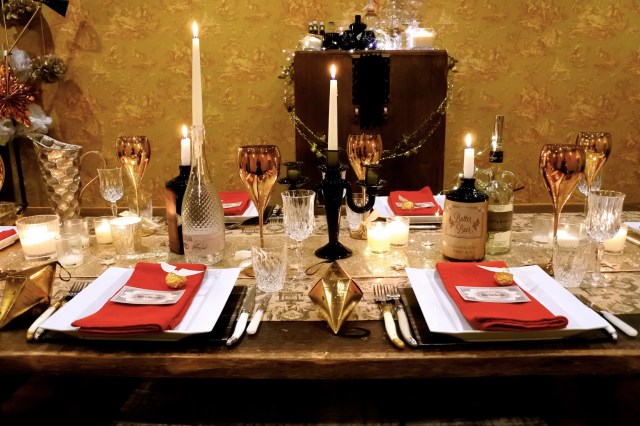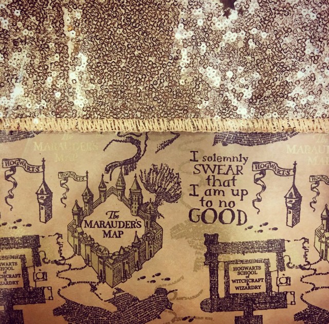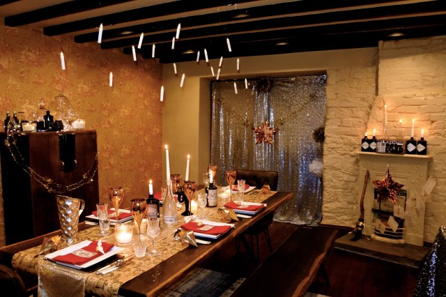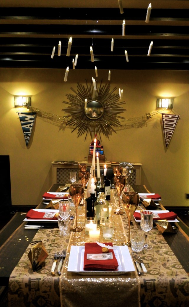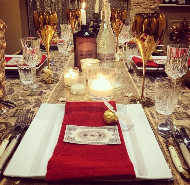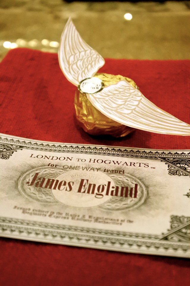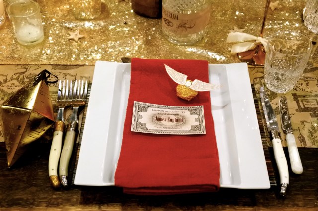 We decided not to replicate the table decor (mainly due to lack of time and resources), and instead opted for a simpler design with some nods to key parts of the books/movies. The runner was created using a piece of wrapping paper from Primark featuring the Marauders Map, with a sequin overlay. Platform 9 3/4 place names were customised from Etsy and the golden snitch furnished from a classically festive Ferrero Rocher with printed wings from Party Delights.