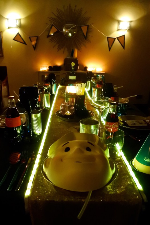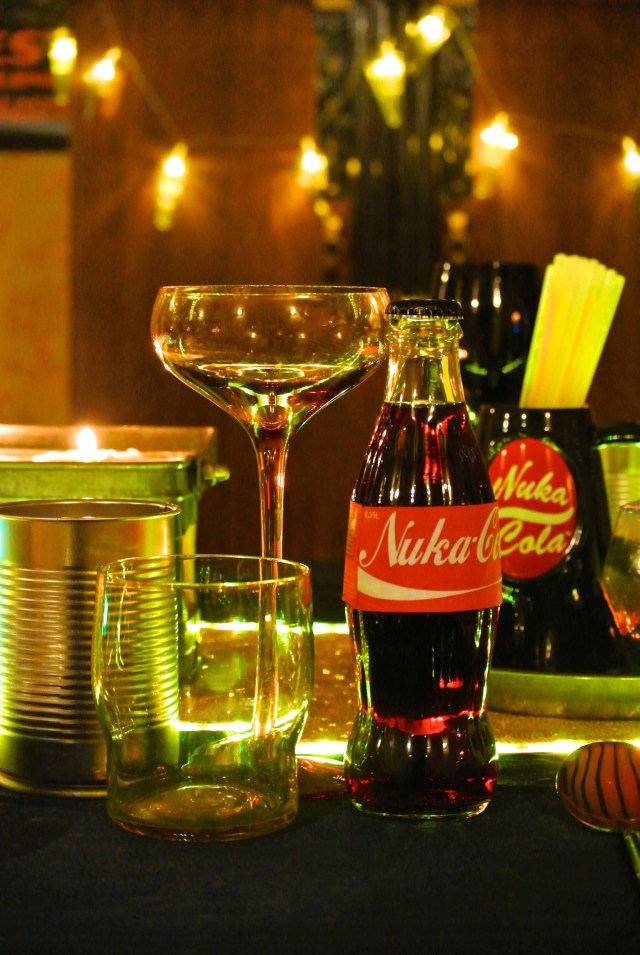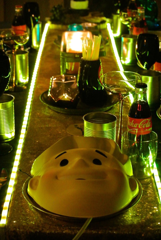 In the spirit of trying to avoid buying too much new stuff, I re-use our awesome LED strip lighting (changed from the white I recently used in my DS9 party to a radioactive yellow) and re-used the bottle labels for the Nuka Cola from last time.