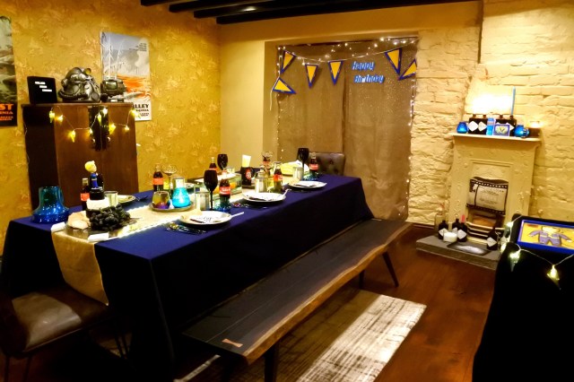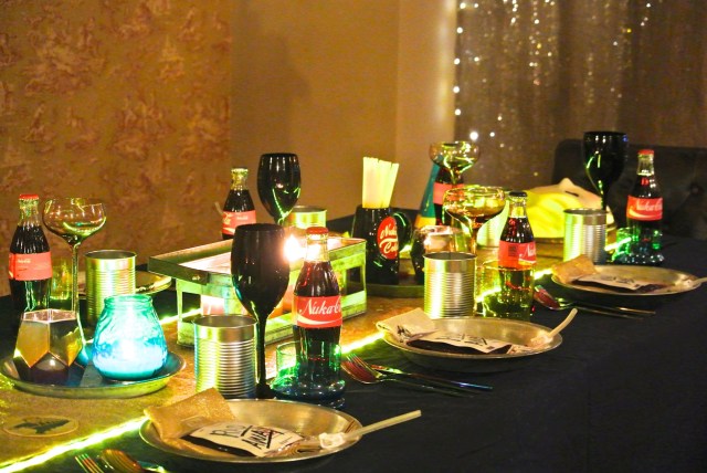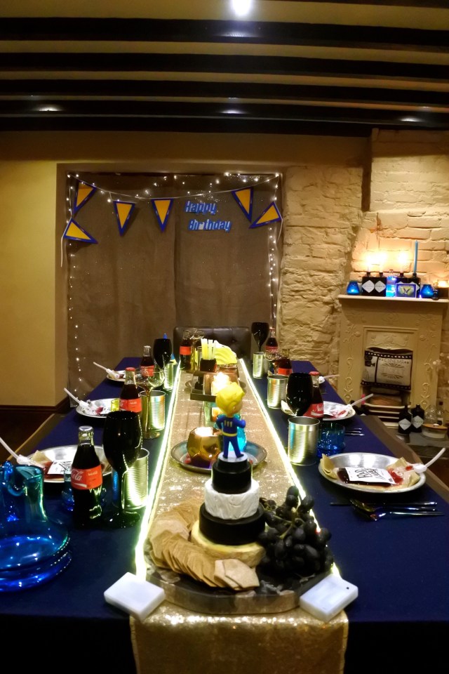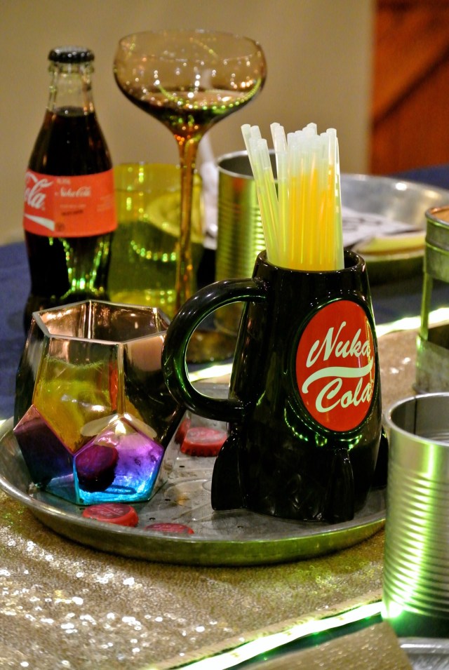 Whilst I wanted to use the traditional blue and yellow Fallout colours, I was keen to re-invigorate our previous styles and decided to add a touch of sparkle and iridescence to the mix. The gold sequin table runner we had bought for Christmas was perfect for the occasion, as were the oil slick cutlery, both working well with the blue and yellow palette.