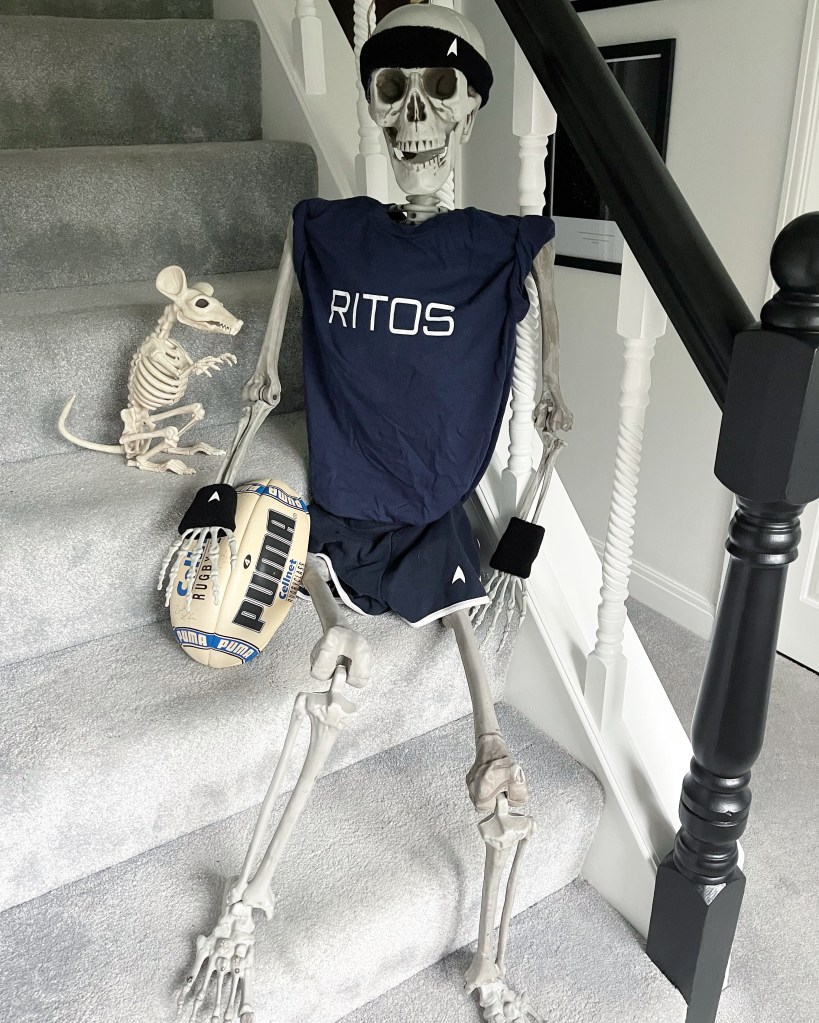 You could also recreate the appearance of the giant Spock skeleton in the Lower Decks season 2 episode “Kayshon, His Eyes Open“ with your very own full-sized skeleton for some Trek-appropriate cosplay. Shown here both as a proud Chat Pack member (with retro Defiant CD player, of course) and also sporting this season’s latest USS Cerritos athletic-wear.